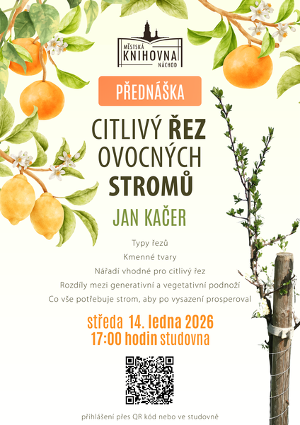 Ve středu 14. ledna vás od 17:00 hodin zveme do studovny na přednášku zkušeného sadaře Jana Kačera. Máte vysazené ovocné stromy a přemýšlíte, jak a proč je prořezávat? Plánujete výsadbu a chcete si potvrdit, že myslíte na vše nezbytné? Na přednášce se dozvíte, co vše potřebuje strom, aby po vysazení prosperoval, i jaké nářadí je vhodné pro citlivý řez. Lektor nám přiblíží různé typy řezů a zaměří se na řez výchovný, který ovlivní hierarchii koruny stromu na zbytek jeho života. Vstupné je dobrovolné, přihlášení probíhá ve studovně nebo na webu https://www.naucmese.cz/kurz/citlivy-rez-ovocnych-stromu-pouze-teorie#termin-14-01-2026.