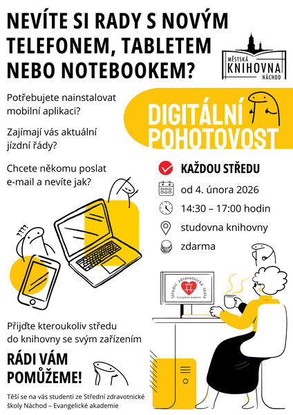 Digitální pohotovost probíhá každou středu od 4. února 2026, vždy od 14:30 do 17:00 hodin. Vše je zdarma, stačí přijít se svým zařízením do studovny. Předchozí objednání není nutné.