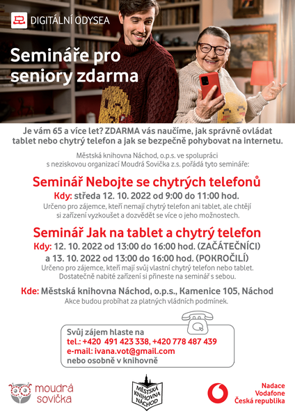 Ve spolupráci s neziskovou organizací Moudrá Sovička nabízíme seminář pro seniory ve věkové kategorii 65+, kteří se chtějí naučit, jak správně ovládat tablet nebo chytrý telefon a jak se bezpečně pohybovat na internetu.