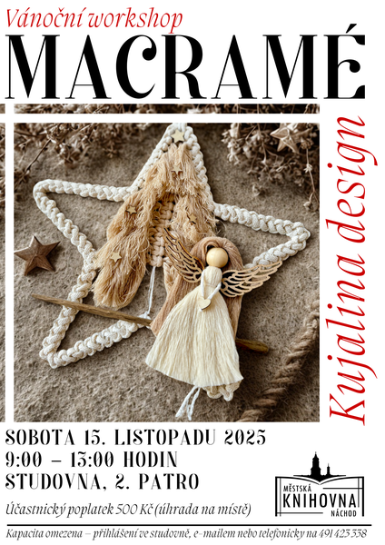 V sobotu 15. listopadu pořádáme ve studovně od 9:00 do 13:00 hodin workshop, na kterém nás regionální umělkyně Aneta Kujalová (Kujalina design) naučí vytvářet vánoční dekorace z provázků. Počet míst je omezený, prosíme proto o přihlášení ve studovně, e-mailem nebo na 491 423 338. Účastnický poplatek činí 500 Kč (platba na místě).
