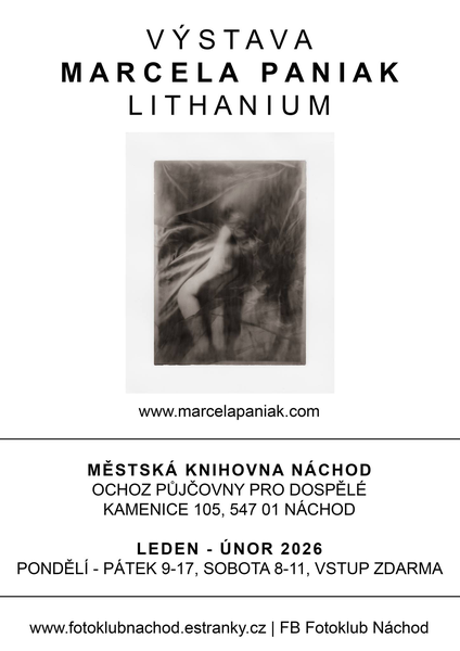 Fotoklub Náchod zve na výstavu fotografií Marcely Paniak s názvem Lithanium. Výstava probíhá od ledna do února 2026v mezipatře oddělení pro dospělé. Autorka představuje cyklus fotografií vytvořených lithovým tiskem, zaměřený na paměť, tělo, identitu a proměnlivost přítomnosti.