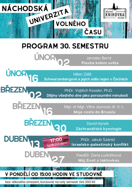 Už 16. rokem nabízíme v rámci NUVČ možnost rozšířit si obzory a setkat se s odborníky z různých oblastí. První přednáška 30. semestru proběhne v pondělí 2. února a v jeho průběhu se můžete těšit například na plavbu kolem světa s Jaroslavem Berntem či na vyprávění Milana Záliše o rodu Schwarzenbergů.
