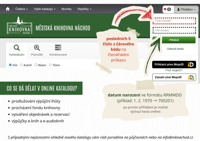 V souvislosti s přechodem na nový knihovní systém dochází i ke změnám v online katalogu. Nově se všichni čtenáři přihlašují posledními pěti čísly čárového kódu na čtenářském průkazu a datem narození ve formátu RRMMDD. Toto výchozí heslo je po prvním přihlášení možné změnit.